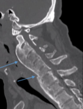 OPLL is present in approximately 50% of patients with cervical DISH and is most common in the cervical spine, representing 75% of all OPLL cases (2). OPLL may occur in the thoracic and lumbar spine as well. It is twice as common in men than women and slightly more common in Asian countries (3). Patients with OPLL may be asymptomatic or present with symptoms consistent with central canal stenosism such as radiculopathy and myelopathy. Cord injury from minor trauma is also a greater risk in those patients with OPLL, particularly in the cervical spine. CT imaging is the best imaging modality to assess the degree of central canal stenosis. Treatment may be conservative, but surgical treatment may be appropriate when neurologic symptoms are present. Great care and caution should be taken when assessing and treating your patients with OPLL.