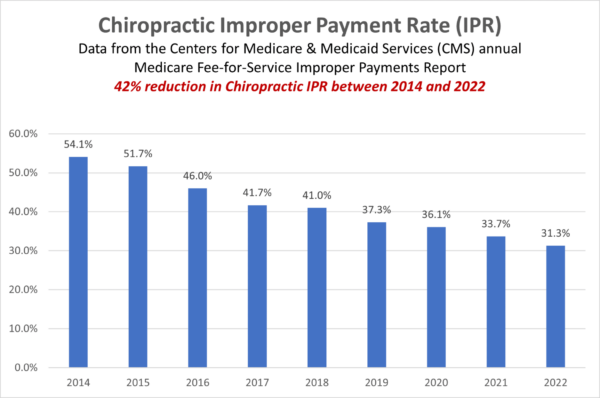 As you see in the chart below, improper payments were attributed to over 54% of all Medicare FFS claims related to chiropractic in 2014. However, in 2022, that number was reduced to just over 31%, a 42% reduction in the chiropractic Improper Payment Rate (IPR).