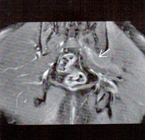 I have included 3 images from 3 different patients to illustrate some typical MRI findings in piriformis syndrome. Figure 1 is a fat-suppressed coronal image. The arrow points to the left piriformis muscle, which exhibits an increased signal intensity when compared to its right-sided counterpart.