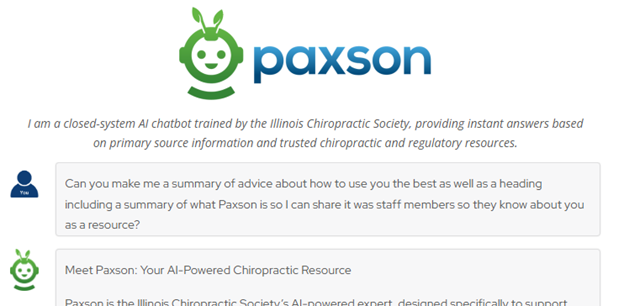 Paxson is the Illinois Chiropractic Society’s AI-powered expert, designed specifically for ICS members and their staff. Paxson provides quick, accurate, and ICS-vetted answers on a wide range of topics including compliance, clinical best practices, chiropractic regulations, insurance, documentation, and practice management. Built on a foundation of over 1,600 ICS articles, videos, and regulatory documents, Paxson ensures you have reliable information at your fingertips to support your practice and patient care.