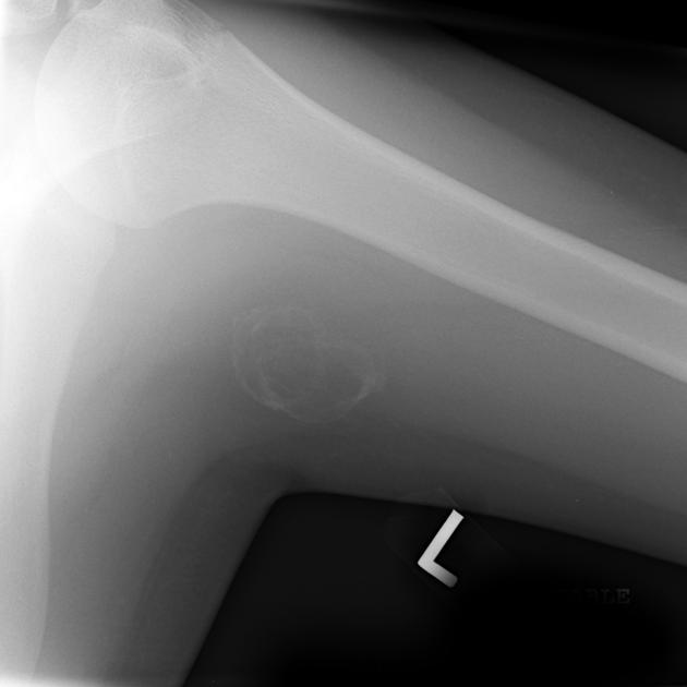 Figure 1 demonstrates early calcification of a myositis ossificans lesion in the left triceps muscle. As is characteristic, there is an outer shell of bone with a lucent central region. Figure 2 is a more mature, well-defined lesion with a dense periphery at the medial aspect adjacent to the femur.