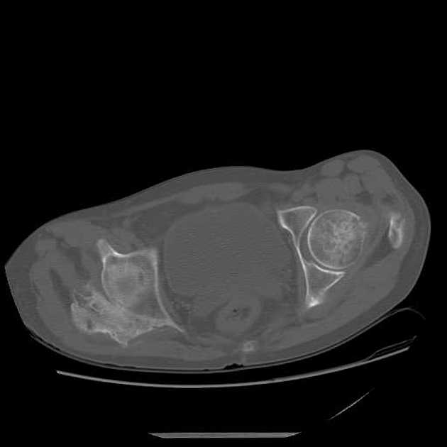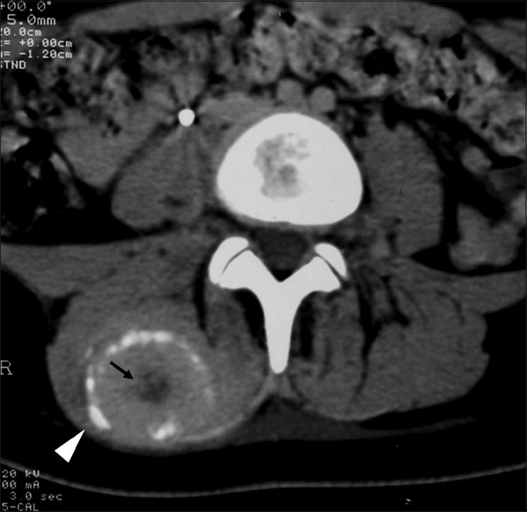 CT may be useful in the visualization of a lesion. Figure 3 demonstrates a lesion posterior to the right acetabulum. It demonstrates a partially corticated periphery and partial cleft separating the lesion from the acetabulum. Figure 4 is an interesting example of an MO lesion in the paraspinal musculature, with ossified periphery and lucent center.