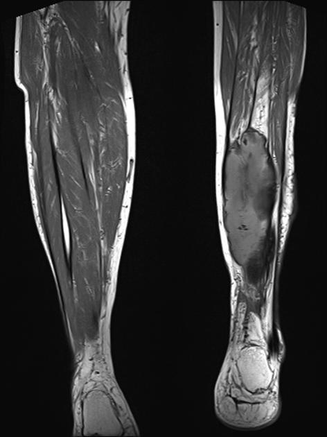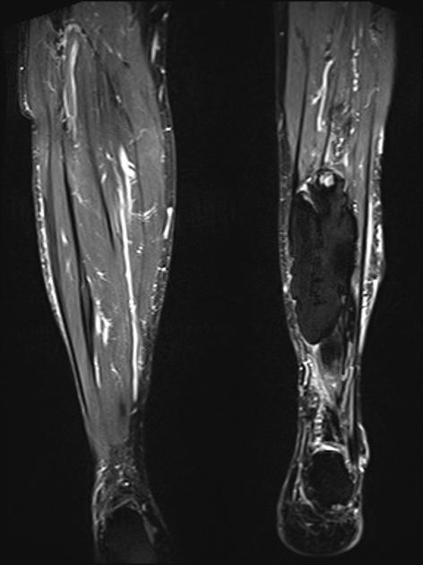 Figure 5 is a T-1 weighted image of an MO lesion in the left lower leg. It is fairly isointense to muscle on this image with a low signal periphery. Figure 6 is an accompanying STIR image, which demonstrates a fatty component and thus manifests a uniformly low signal.