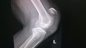 A finding on plain film x-ray may be a thickening of the soft tissue anterior to the patellar ligament. This is demonstrated on a lateral view of the knee (Figure 1). When it is this prominent, there may be an actual palpable mass. When less fluid is present, there may be a puffiness over the ligament that may be palpable.