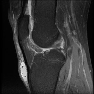 Figure 3 demonstrates a fluid filled bursa over the ligament and distal patella. On this fat suppressed image, the bursa manifests high signal intensity (white), due to the relatively pure fluid content.