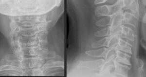 In the lateral view of figure 1, note the horizontal radiolucent line through C5 and C6. This finding is often mistaken for a fracture on radiographs. The AP radiograph nicely demonstrates uncinate process hypertrophy at C6 and C7. The degenerative hypertrophy of the uncinate processes causes an abnormal pseudoarthrosis to form between the uncinate process below and the inferior vertebral body above. This pseudoarthrosis results in the horizontal radiolucency seen traversing the vertebral body.