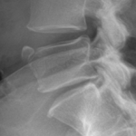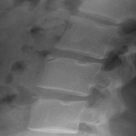 A limbus bone is an unfused secondary ossification center of the vertebral body (typically the anterosuperior corner), due to herniation of the nucleus pulposus through the ring apophysis prior to skeletal development. This fragment remains ununited to the vertebral body throughout the patient’s life. This can be differentiated from a fracture in that it is well-corticated, triangular, and the fragment of bone will not exactly “fit” into the defect. These fragments may be smaller than the defect of the bone (figure 2) or they may hypertrophy over time and become larger (figure 3). A limbus bone is most often asymptomatic.