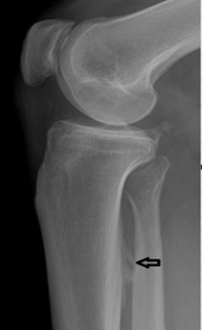 Figure 4 demonstrates prominent ossification that obliquely traverses the proximal tibia at the origin of the soleus muscle. Figure 5 demonstrates a thick osseous protrusion along the posterior tibia. This normal variant can be mistaken for an aggressive periosteal reaction or pathologic heterotopic ossification. But the anatomic orientation of the ossification along the soleal insertion and no involvment of the underlying bone should allow the clinician to easily identify this variant. This normal viariant has also been termed tibial pseudoperiostitis or tibial tug lesion.