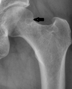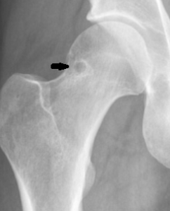 This non-pathologic radiolucency is seen in up to 5% of the adult population and is most often asymptomatic, though symptomatic cases have been described. The classic appearance is a round, ovoid, or “8-shaped” radiolucency with a thin sclerotic border most often found at the anterior superior femoral neck, though it can be found in the anterior inferior femoral neck as well. It is formed by a herniation of synovium through a cortical defect of the femoral neck. They are usually 5-mm or less in diameter and are more often found unilaterally than bilaterally.